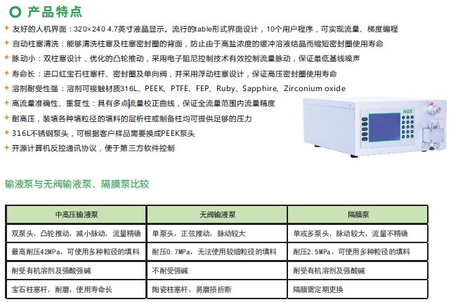 柱塞泵是目前液相色譜主流的輸液單元,特別是雙柱塞往復(fù)泵。它有一個精心設(shè)計的偏心凸輪,用同步電機或變速直流電機驅(qū)動偏心凸輪,偏心凸輪再推動兩活塞作往復(fù)運動。偏心凸輪短半徑端所對應(yīng)的活塞向外伸,使該活塞的下單向閥打開吸入流動相,與此同時,偏心凸輪的長半徑端所對應(yīng)的另一活塞被推入,使其上單向閥打開,并將流動相送至色譜柱。具有操作方便、流速穩(wěn)定、壓力脈動小、故障率低的優(yōu)點。根據(jù)流量大小一般可分為分析型和制備型。