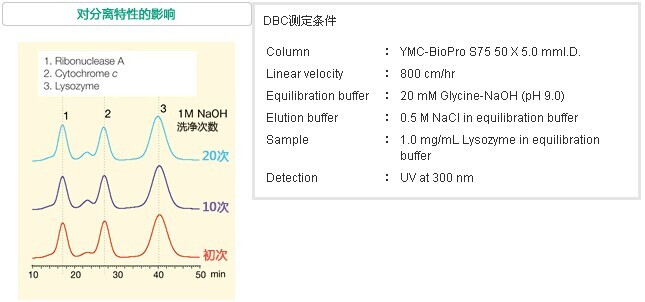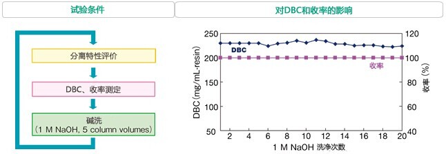 對于蛋白質(zhì)純化用色譜柱的清洗/殺菌常采用堿性溶液進(jìn)行定位清洗的方法(CIP:cleaning in place)。YMC-BioProl離子交換填料因?yàn)榫哂凶吭降哪蛪A性,所以即使使用1M NaOH實(shí)施20次的CIP也能維持高DBC和收率,而不會發(fā)生分離特性的改變。