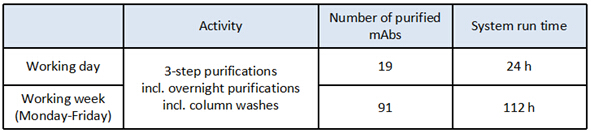 ? ? ? ?Discovery高通量(HT)型系統(tǒng),采用Protein A - CIEX- Desalting三步向?qū)K,每次上樣10 mL單抗上清液(1.0 mg/mL),每次產(chǎn)量均≥6.5 mg。單個樣品的三步純化耗時約為74 min,在24 h內(nèi)純化出多達19個樣品,而且該時間包含了層析柱的清洗環(huán)節(jié)。該系統(tǒng)持續(xù)運行5天,純化樣品總數(shù)量高達91個。