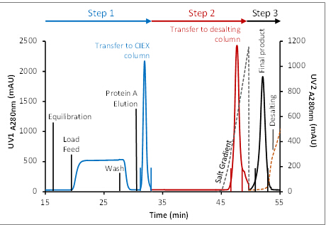 ? ? ? ?在該過程中,Protein A的洗脫組分經(jīng)過在線稀釋,直接上樣至CIEX層析柱,CIEX進行線性洗脫,去除降解物及聚集體,將目標組分直接上樣至脫鹽柱。三步層析緊密銜接,前一步層析的洗脫與后一步層析的上樣同時進行,使得純化效率顯著提高。