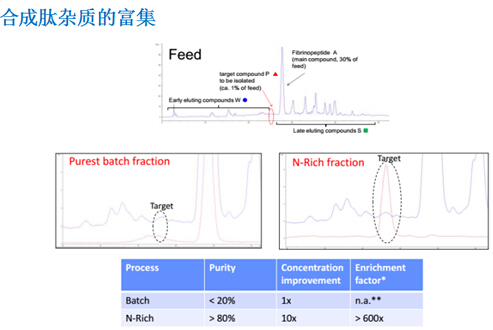 ? ??? ?N-Rich工藝是微量物質(zhì)的富集過程,比如將產(chǎn)品的相關(guān)雜質(zhì)選擇性地富集在一個循環(huán)的層析過程中,待富集至目標量,再進行洗脫回收。該方法特別適用于分離與產(chǎn)品有關(guān)的雜質(zhì),如異構(gòu)體和聚集體,并同時用于發(fā)現(xiàn)研究。