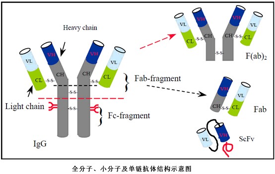 抗體的重鏈可變區(qū)以及輕鏈(VH+VL),通過一段多肽連接,形成單鏈抗體的可變區(qū)(ScFv)。穿透力強但往往親和力下降。分子量在~25kDa。Alexion?Pharmaceutical公司研制的Pexelizumab,主要用于治療冠狀動脈疾病。