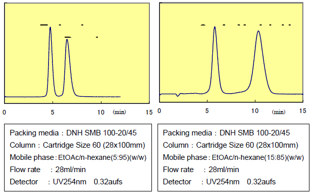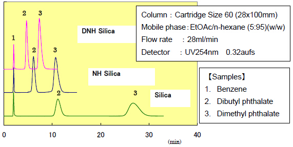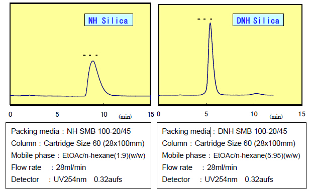 DNH硅膠鍵合的二元胺和一元胺是NH硅膠的2倍。基于這個(gè)原因,DNH硅膠的堿度要比NH硅膠強(qiáng),并且由于碳鏈較長(zhǎng),DNH硅膠的氫鍵作用要比NH硅膠弱一些。因此,DNH硅膠的流動(dòng)相要選擇極性小的溶劑,因?yàn)?/span>DNH硅膠的洗脫速度要比普通的裸硅膠和NH硅膠快。