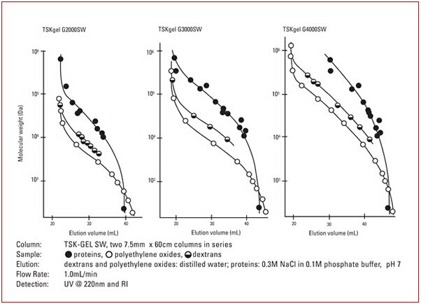 TSKgel SW柱的聚氧化乙烯、葡聚糖和蛋白質(zhì)校準(zhǔn)曲線