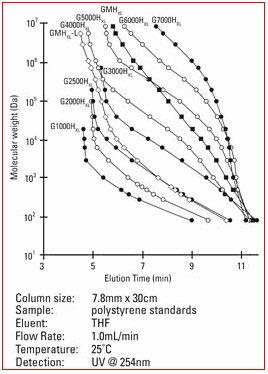 4. Hxl型柱屬于常規(guī)GPC色譜柱,尺寸為7.8mm ID ×30cm。大多數(shù)HPLC系統(tǒng)無需進行特殊的優(yōu)化(針對柱外峰展效應),即可使用常規(guī)的GPC色譜柱。