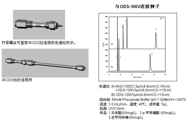 TSKgel NH2-100 DC 3μm 以鍵合了氨烷基的硅膠填料裝填了與后段的分析柱可以直接連接的色譜柱。不使用連接管也可連接2根色譜柱,可減少導(dǎo)致分離性能降低的死體積,2根分離模式不同的色譜柱的一體化,使用起來更方便。鍵合的氨基作為陰離子交換基發(fā)揮作用,協(xié)助完成后段色譜柱的分離,從而實(shí)現(xiàn)更好的分離成為可能。特別是與反相色譜柱的連接,醫(yī)藥品中的藥效成分和共存陰離子的同時分析成為可能。