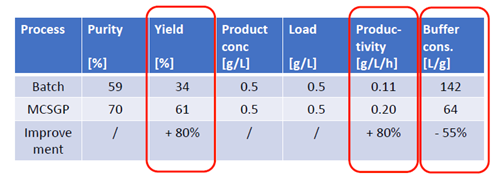 ??? 有案例證明,MCSGP可將產(chǎn)品純度從傳統(tǒng)工藝的59%提升至70%,將收率從傳統(tǒng)工藝的34%提升至61%,從而使產(chǎn)量(g /L /h)整體提升80%,并同時(shí)使Buffer的消耗量降低55%。MCSGP工藝,無(wú)疑可顯著地節(jié)約成本投入,并可產(chǎn)生更多的生產(chǎn)效益。