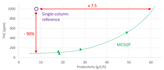 MCSGP可用于不同工藝要求。如果對(duì)目標(biāo)產(chǎn)品的純度要求并不高,采用MCSGP可使產(chǎn)率進(jìn)一步提高。比如某企業(yè)要求THC含量上限為1000 ppm時(shí),收率水平不得低于85%,用MCSGP代替單柱層析后,產(chǎn)率由原來(lái)的8 g/L/h提高到了60 g/L/h以上。而另一工藝情況為,當(dāng)從單柱層析轉(zhuǎn)換為MCSGP時(shí),保持產(chǎn)率不變,雜質(zhì)THC含量可從1000 ppm降低至100 ppm。見(jiàn)圖12純度 - 產(chǎn)率曲線。