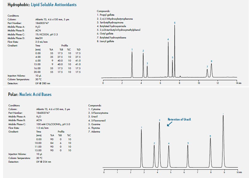 在對于極性化合物的反相HPLC保留與分離方面,Atlantis T3為極性化合物保留設(shè)立了行業(yè)標(biāo)準(zhǔn)。Atlantis T3色譜柱是通用的、硅膠反相C18柱,它不僅能保留和分離水溶性的極性小分子有機化合物,而且還為這項優(yōu)異能力提供了更寬的pH操作范圍。對于反相應(yīng)用,要開發(fā)極性(和非極性)化合物的保留分離方法時,Atlantis T3應(yīng)該作為第一選擇。